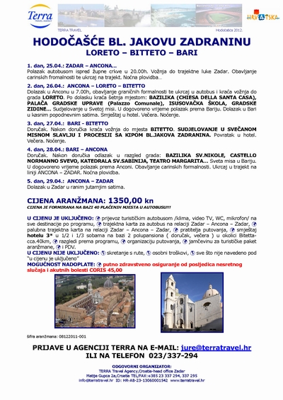 2. dan, 26.04.: ANCONA – LORETO – BITETTO. 3. dan, 27.04.: BARI - BITETTO. 4. dan, 28.04.: BARI – ANCONA. 5. dan, 29.04. 2012.: ANCONA – ZADAR Dolazak u Zadar u ranim jutarnjim satima. CIJENA ARANŽMANA: 1350,00 kn