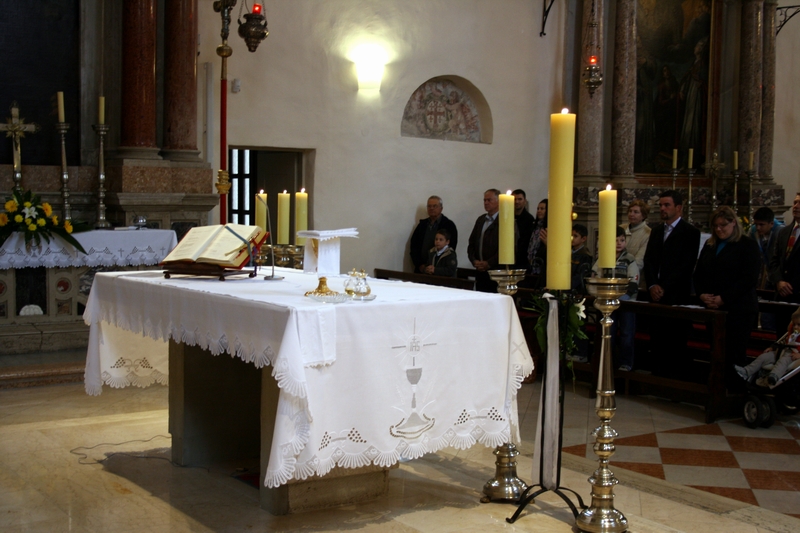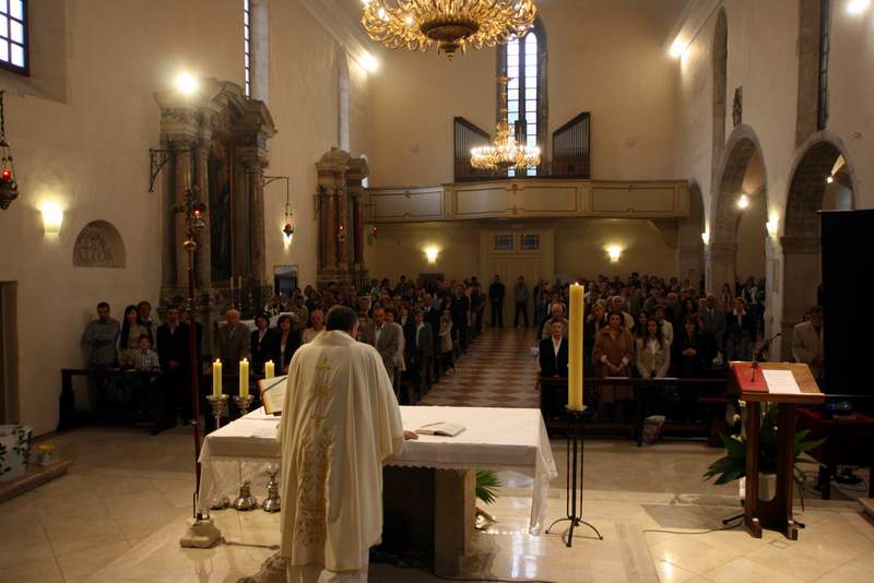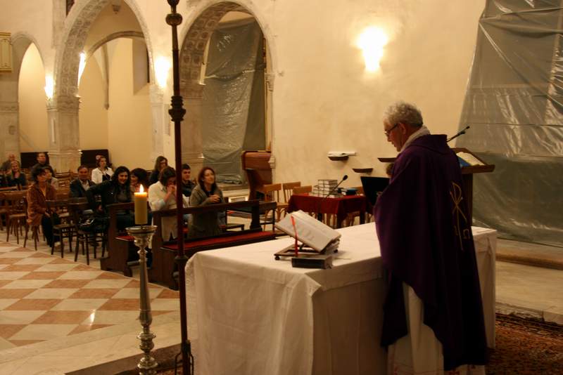 Misa uoči Cvjetnice 16. travnja 2011. u našoj crkvi sv. Frane u Zadru. Tu se vidi još skela. Donijeli smo privremeno sjedalice. Postavili drveni stol da možemo slaviti sv. Misu na Cvjeetnicu.