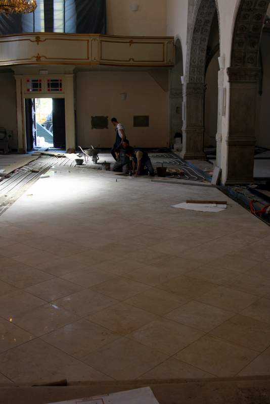 24. travnja 2011. Kamen je postavljen. Slijedi uređenje vjetrobrana (ulaznih vrata), skala za kor i bojanje oštećenih dijelova. Izrada novog ambona.