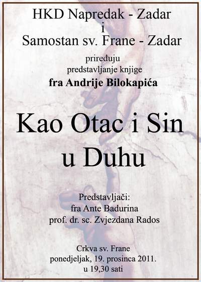 U ponedjeljak, 19. prosinca 2011. godine HKD Napredak – Zadar i Franjevački samostan sv. Frane u Zadru priređuju predstavljanje knjige fra Andrije Bilokapića Kao Otac i Sin u Duhu (Sarajevo – Zadar, 2011.).