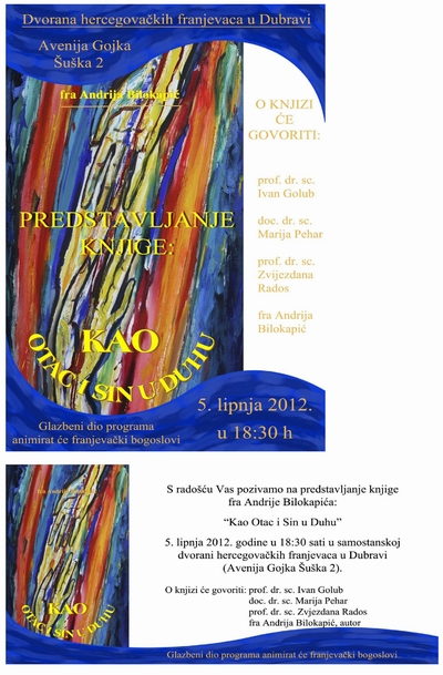 Zagbreb, (IKA) - U franjevačkom samostanu Hercegovačke franjevačke provincije u Dubravi, Zagreb, Avenija Gojka Šuška 2, u utorak 5. lipnja s početkom u 18.30 sati, bit će predstavljena knjiga novoizabranog provincijala Franjevačke provincije sv. Jeronima fra Andrije Bilokapića "Kao Otac i Sin u Duhu".
