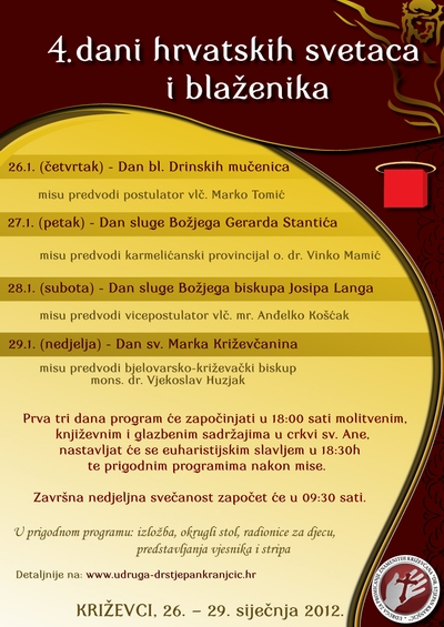 4. danihsib- program u PDF-u Četvrti dani HRVATSKIH SVETACA I BLAŽENIKA u Križevcima od 26. do 29. I. 2012. : PLAKAT 4. DANI HRVATSKIH SVETACA I BLAŽENIKA : 4.danihsib - pozivnica : 4. danihsib - program : 4. dani hrvatskih svetaca i blazenika ATT00015 tekst u wordu :