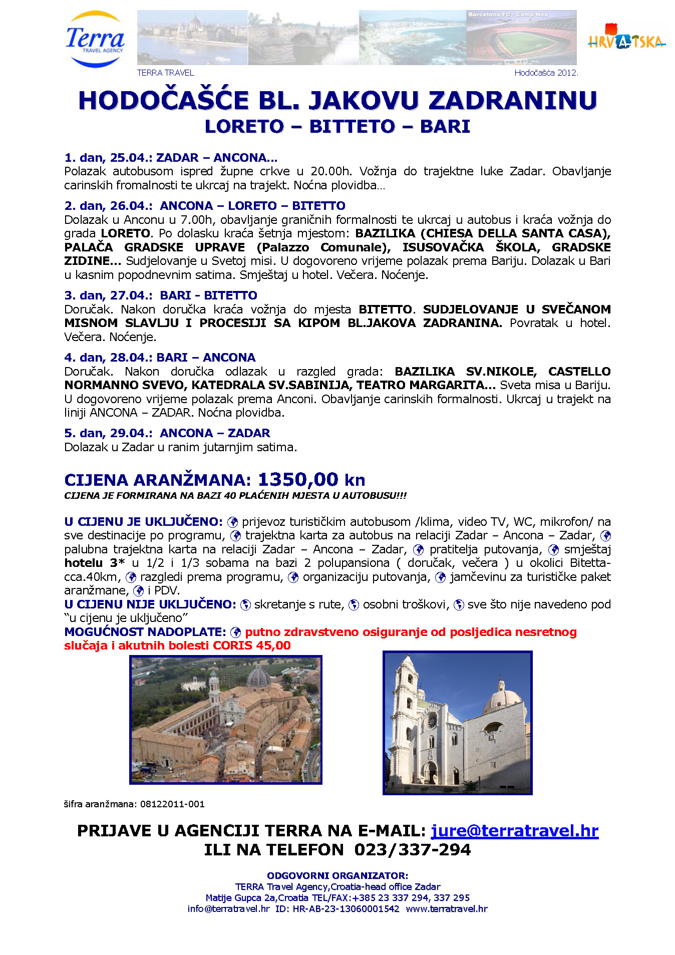 2. dan, 26.04.: ANCONA – LORETO – BITETTO. 3. dan, 27.04.: BARI - BITETTO. 4. dan, 28.04.: BARI – ANCONA. 5. dan, 29.04. 2012.: ANCONA – ZADAR Dolazak u Zadar u ranim jutarnjim satima. CIJENA ARANŽMANA: 1350,00 kn