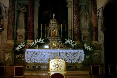 Misa uoči Cvjetnice 16. travnja 2011. u našoj crkvi sv. Frane u Zadru. Tu se vidi još skela. Donijeli smo privremeno sjedalice. Postavili drveni stol da možemo slaviti sv. Misu na Cvjeetnicu.