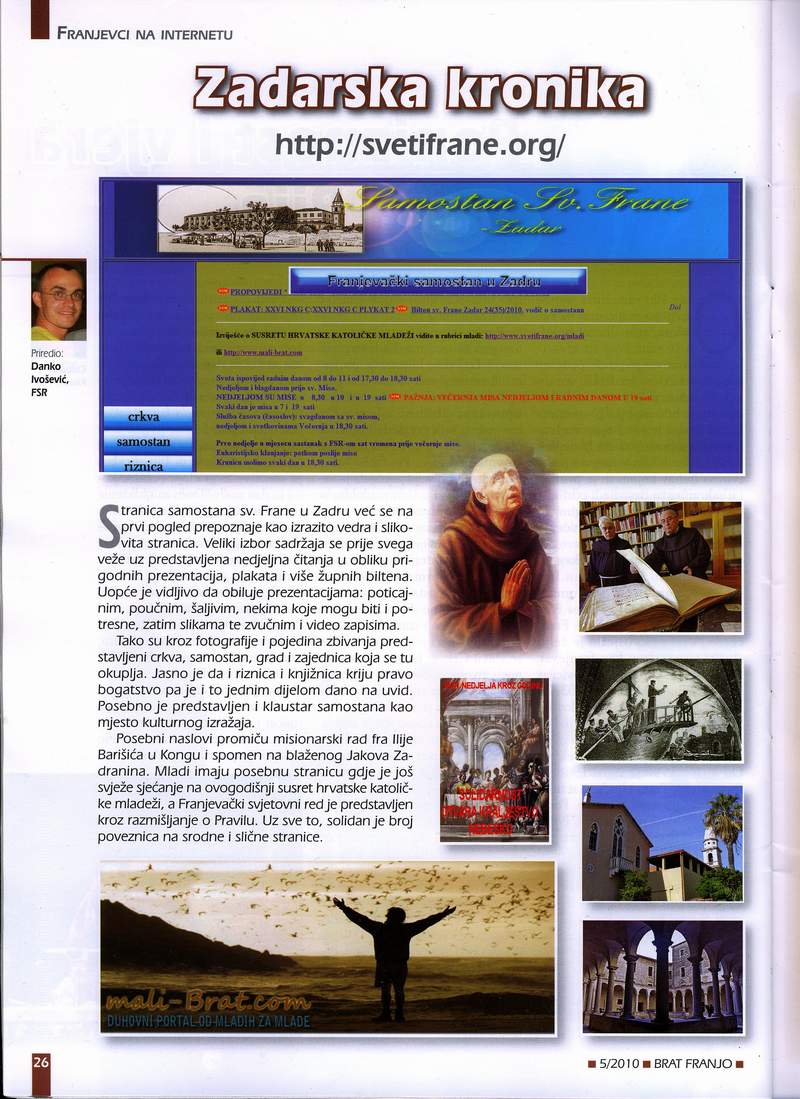 Zahvaljujemo gosp. Danku na lijepom prestavljanju naše stranice. Ovo sve radimo da označimo 2012. godinu kada je pred 800 godina sv. Franjo došao u Hrvatsku (najvjerojatnije tu u Zadar).