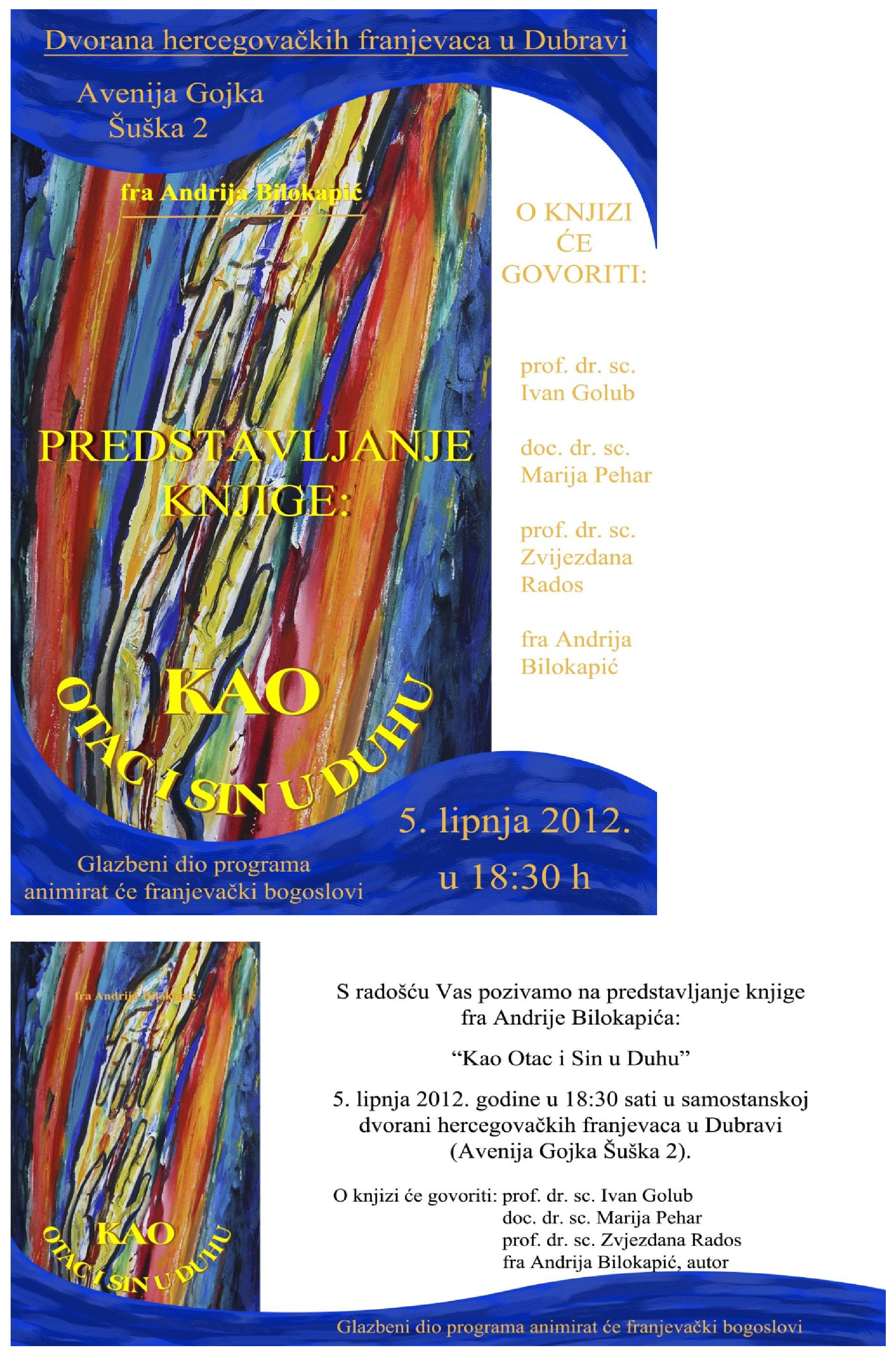 Zagbreb, (IKA) - U franjevačkom samostanu Hercegovačke franjevačke provincije u Dubravi, Zagreb, Avenija Gojka Šuška 2, u utorak 5. lipnja s početkom u 18.30 sati, bit će predstavljena knjiga novoizabranog provincijala Franjevačke provincije sv. Jeronima fra Andrije Bilokapića "Kao Otac i Sin u Duhu".