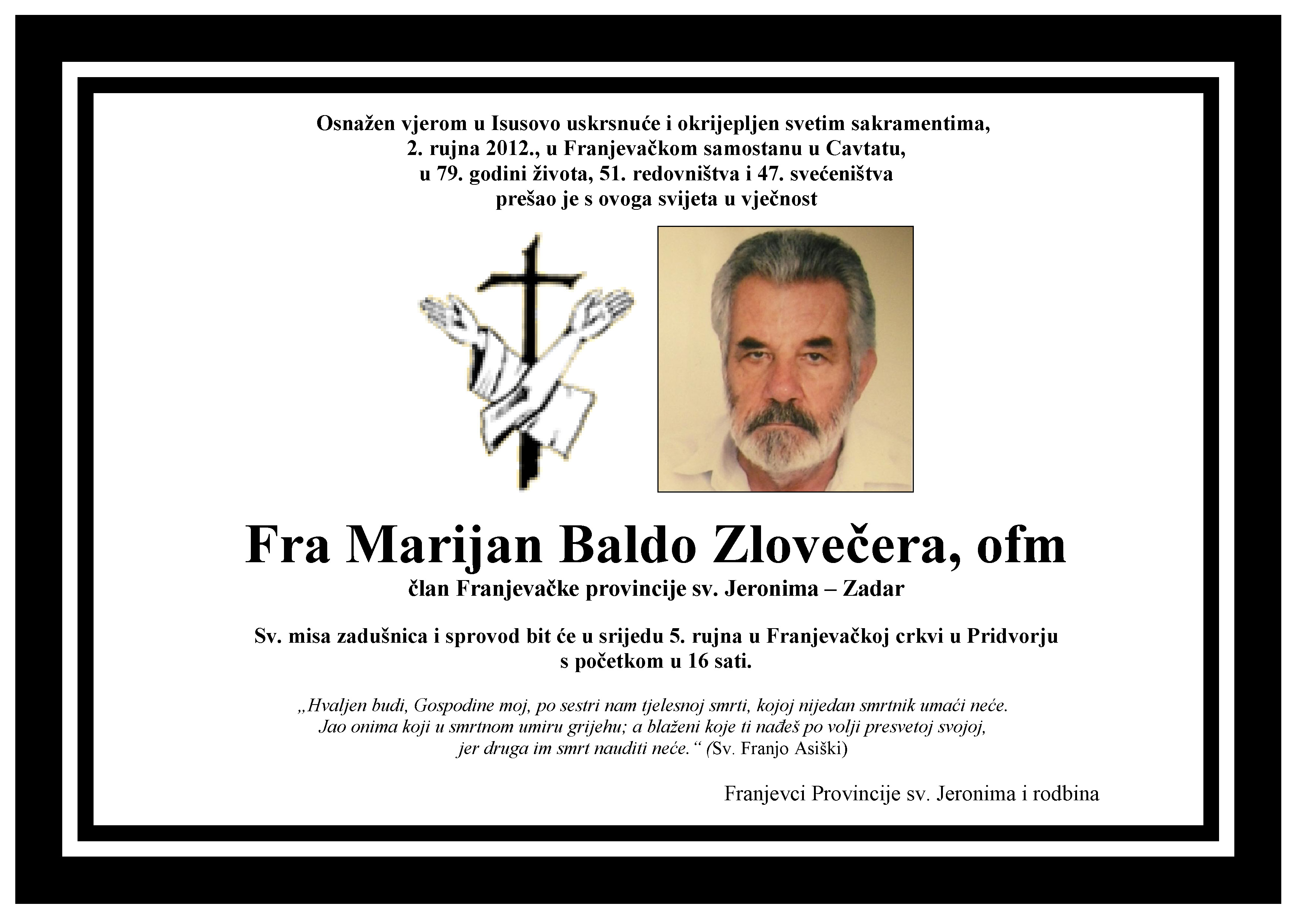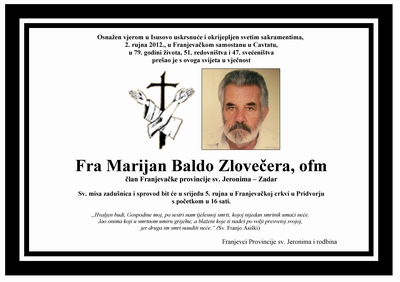 Fra Marijan Baldo Zlovečera umro je 2. rujna 2012. u franjevačkom samostanu u Cavtatu.